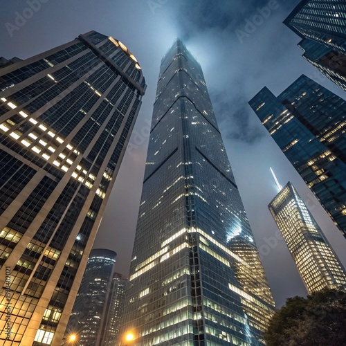 © Shandi Patria, Fototapeta premium Night Skyscrapers Tall Building Bottom View