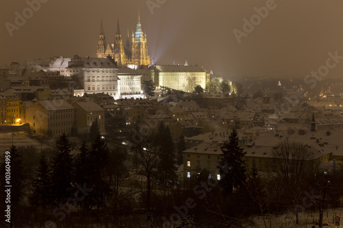 © Kajano, Fototapeta premium Night snowy foggy Prague City with gothic Castle, Czech republic