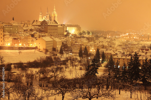 Naklejka premium Night snowy Prague City with gothic Castle, Czech republic