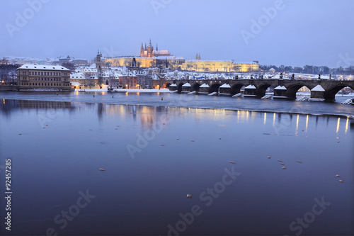 Obraz premium Night snowy Prague gothic Castle and Charles Bridge, Czech Republic