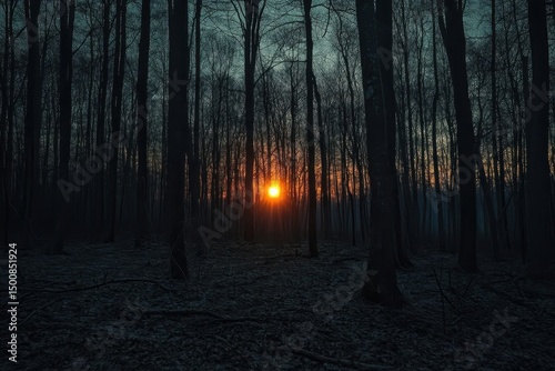 © Vlad, Naklejka premium Night Sunset Dream. A Mesmerizing Night sky Landscape with Sun Setting Behind Trees