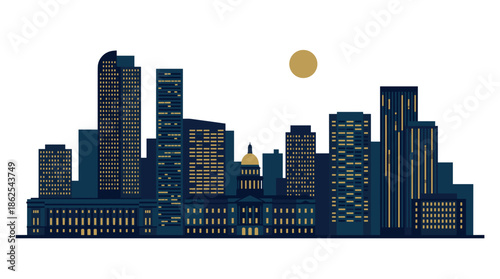 © Juliansyah, Fototapeta premium Night time Denver skyline vector flat illustration with illuminated skyscrapers and State Capitol dome. Dark blue city landscape silhouette with moon and windows.