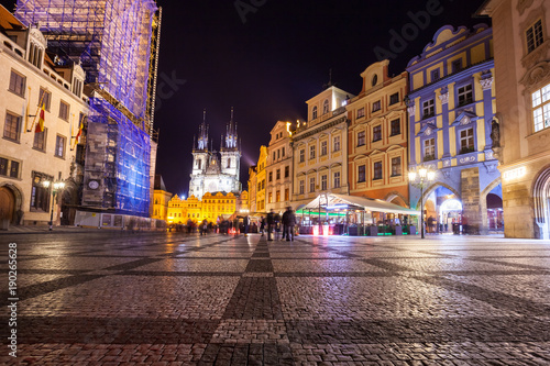 Naklejka premium Night time illuminations of the magical Old Town Square in Prague, visible are Kinsky Palace and gothic towers of the Church
