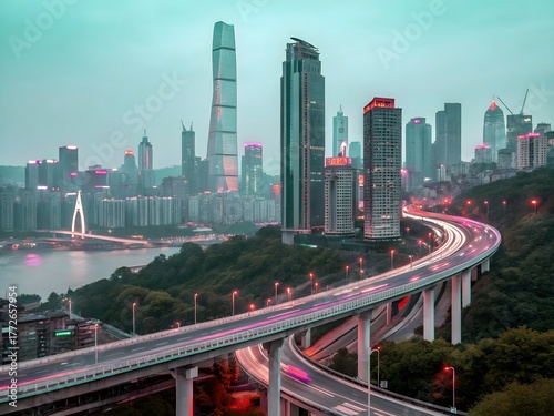 © Monowara, Fototapeta premium Night traffic in hong kong city with glowing lights and skyscrapers