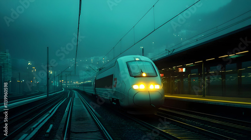 © Clocken, Fototapeta premium Night Train Illustration: Cityscape Railway Journey