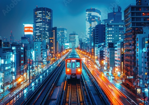 Obraz premium Night Train in the City Lights of Tokyo