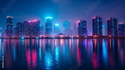 © Sandu, Fototapeta premium Night Urban Cityscape with Neon Lights
