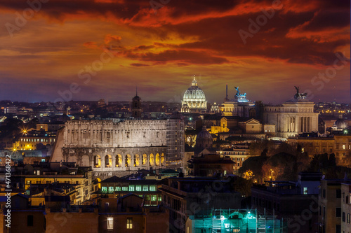© Francesco🇮🇹 Todaro, Fototapeta premium Night view at Coliseum, Fatherland altar and St. Peter's cathedral in Rome with red sunset