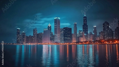 © Panuwat, Fototapeta premium Night view Chicago skyline from across water sky dazzling illuminated