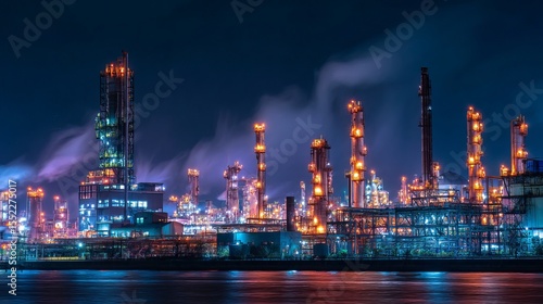 Fototapeta premium Night View Industrial Refinery Complex Illuminated Towers Modern...