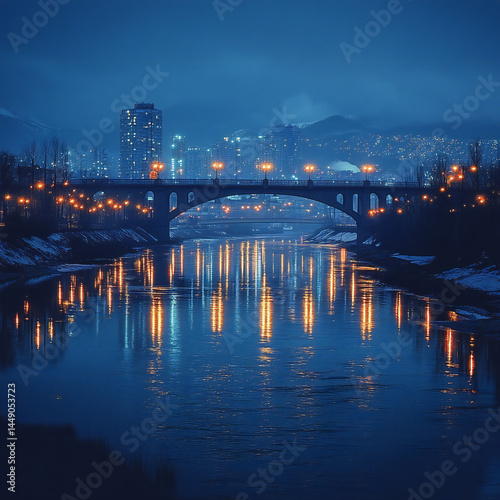 © Digitalindo24, Fototapeta premium Night view of a bridge with city lights reflecting on the water