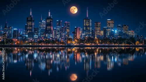 © ADIFERI, Fototapeta premium Night view of a city skyline with a full moon and reflections.