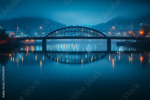 Fototapeta premium Night view of a lit blue bridge reflecting on water