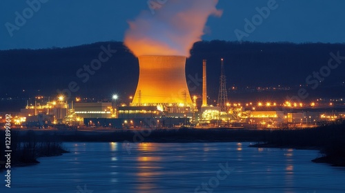 © Feri, Fototapeta premium Night View of a Nuclear Power Plant Illuminated on the Riverbank Against a Dark Mountain Silhouette.