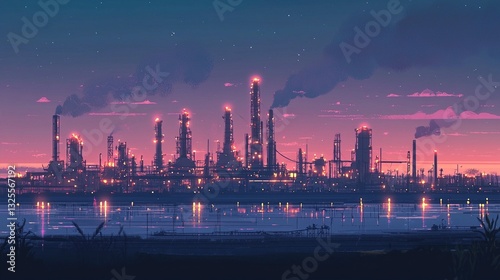 © Arfi Studio, Naklejka premium Night view of an industrial complex by a lake at sunset, with smoke stacks and lights reflecting on the water.