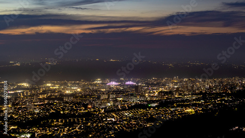 © HumbertoJose92, Fototapeta premium Night view of Bucaramanga, Colombia, with a glowing city skyline, bright stadium lights, and a twilight sky fading into darkness, captured from an elevated viewpoint.