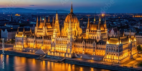 Naklejka premium Night view of Budapest Parliament building from aerial perspective