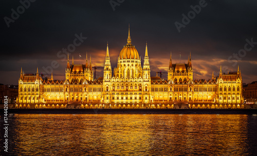 © Balate Dorin, Fototapeta premium Night view of Budapest Parliament glowing over the Danube river, Hungary