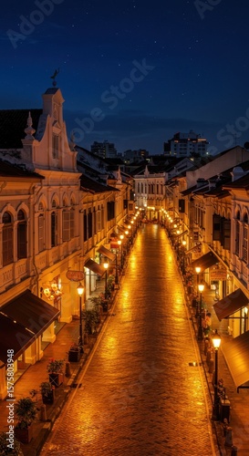 © vector Art, Fototapeta premium Night View of Charming Colonial Street in Melaka, Malaysia: Illuminated Cobblestone Lane with Historic Buildings and Starry Sky
