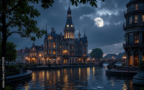 © Cozy Coffee Bar, Fototapeta premium Night View of Chateau-Style Building on Canal with Full Moon