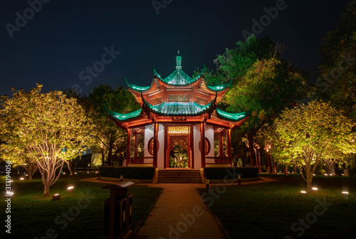 Fototapeta premium Night view of Chinese Pavillion with light decoration at East Lake, Wuhan Hubei / China.