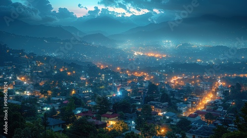 © Ashalina, Obraz premium Night View of City Lights with Mountain Background.