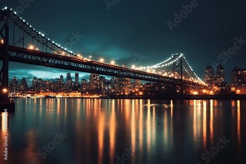 © atar, Fototapeta premium Night view of city skyline with bridge and reflections in water