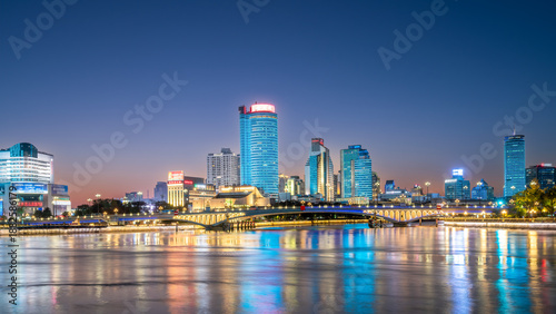 © zhouyilu, Fototapeta premium Night view of city skyline with illuminated skyscrapers and river