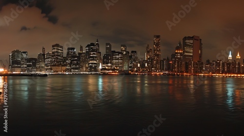 Fototapeta premium Night view of city skyline with skyscrapers and water reflection.
