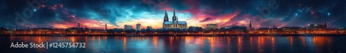 © Mariya, Naklejka premium Night View of Cologne Skyline with Cathedral and Hohenzollern Bridge Over Rhine River