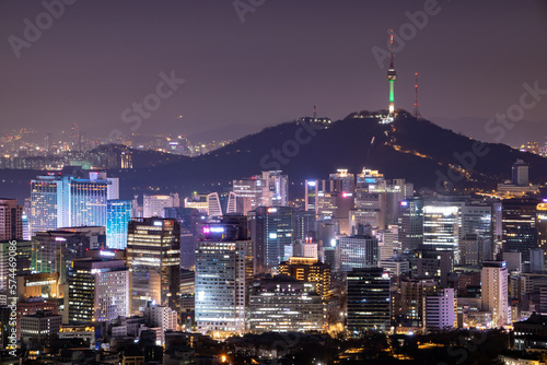 Obraz premium Night view of downtown Seoul skyline, from the top of a hill, South Korea