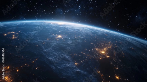 © Rauf, Obraz premium Night view of Earth from space with glowing communication lines.