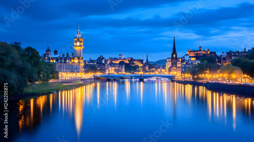 © Lailatul, Obraz premium Night view of Edinburgh's skyline, reflecting on the river, with a castle and bridge, ideal for travel brochures