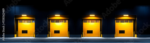 Fototapeta premium Night View of Four Illuminated Yellow Industrial Doors in a Dark Building