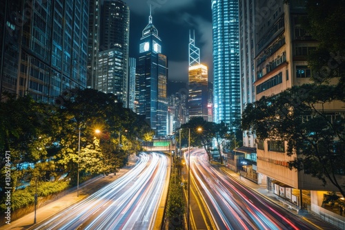 Fototapeta premium night view of Hong Kong street with skyscrapers, car light trails and trees Generative AI