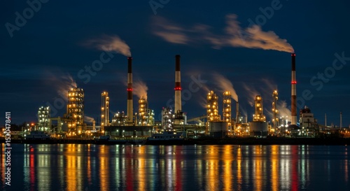 © talkative.studio, Fototapeta premium Night view of illuminated industrial complex reflected in calm water, emitting smoke from tall chimneys