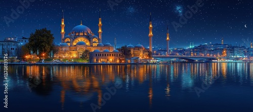 © Wiryo, Obraz premium Night view of illuminated mosque and city skyline reflected in calm water under starry sky.