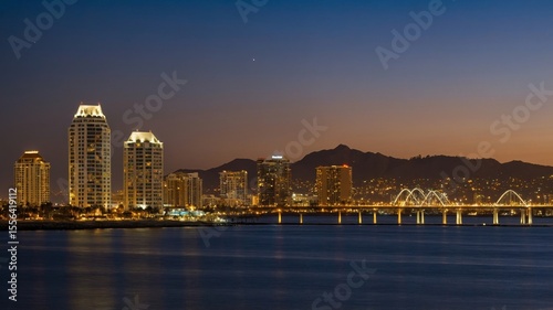 © Monty, Obraz premium Night View of Illuminated Skyscrapers and Bridge in a Vibrant City Skyline During Twilight
