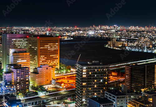 © Naokita, Obraz premium 川崎駅前のビル群や多摩川、東京方面の都市夜景【神奈川県・川崎市】 Night view of Kawasaki City, Tama River, and Tokyo - Japan