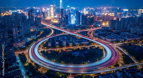 Fototapeta premium Night View of Modern City Skyline with Complex Highway Interchange and Light Trails.
