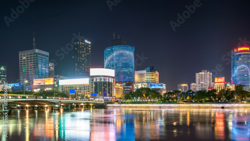 © zhouyilu, Obraz premium Night View of Modern City with Illuminated Skyscrapers