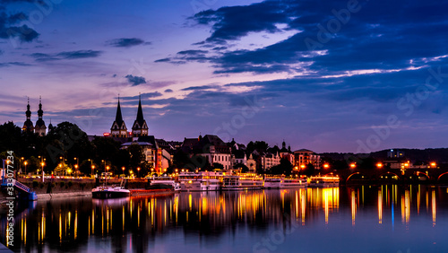 Naklejka premium Night view of Moselle in Koblenz of Germany; buildings reflecting on the water