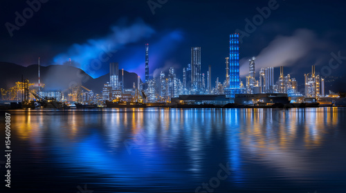 Obraz premium Night view of port activity with industrial lights reflection on water