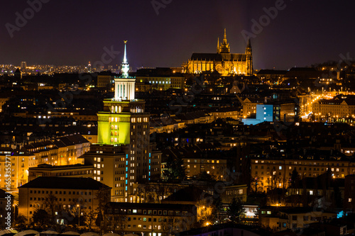 Naklejka premium Night view of Prague, Czech Republic, with illuminated Prague Castle and the Church of St. Vitus in the background.