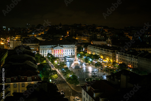 © Pedro, Fototapeta premium Night View of Rossio Square and National Theatre from Santa Justa Elevator - Lisbon, Portugal