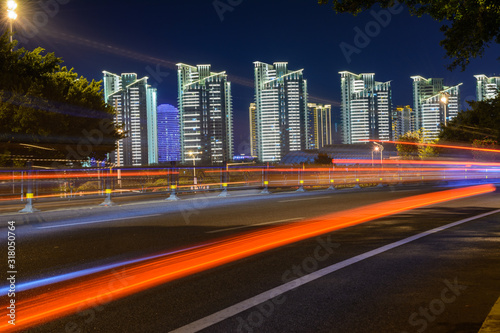 © Evgeniy, Naklejka premium Night view of Sanya city with bright multi-colored illumination buildings, structures, roads, sidewalks, poles, bridges.
