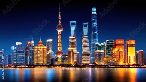 © alvin project, Obraz premium Night View of Shanghai Skyline Featuring Iconic Towers