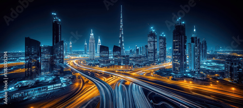 © M.Gierczyk, Obraz premium Night view of skyscrapers and traffic movement