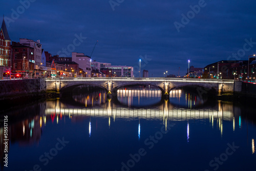 Fototapeta premium Night view of St. Patrick’s Bridge reflected on the River Lee in Cork City,...