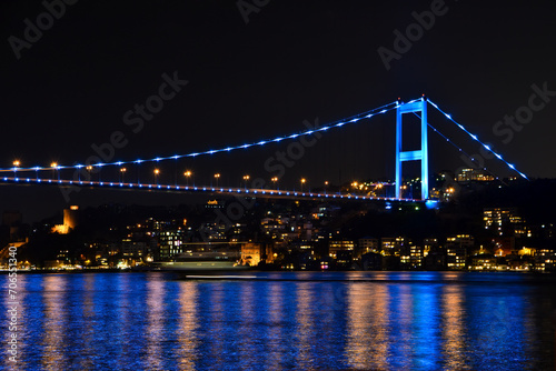 © FatihDama, Fototapeta premium night view of the bosphorus bridge and boats in istanbul